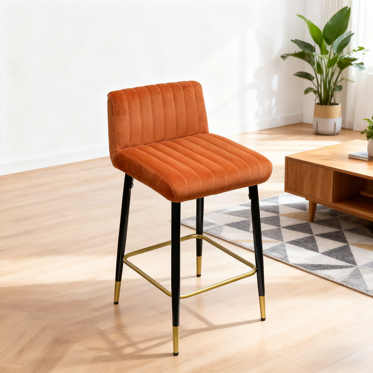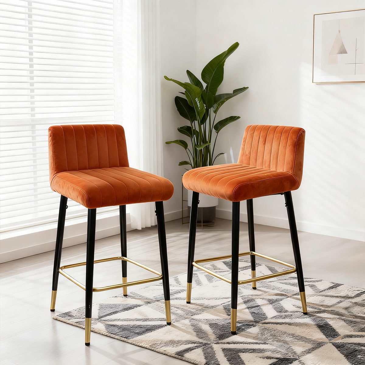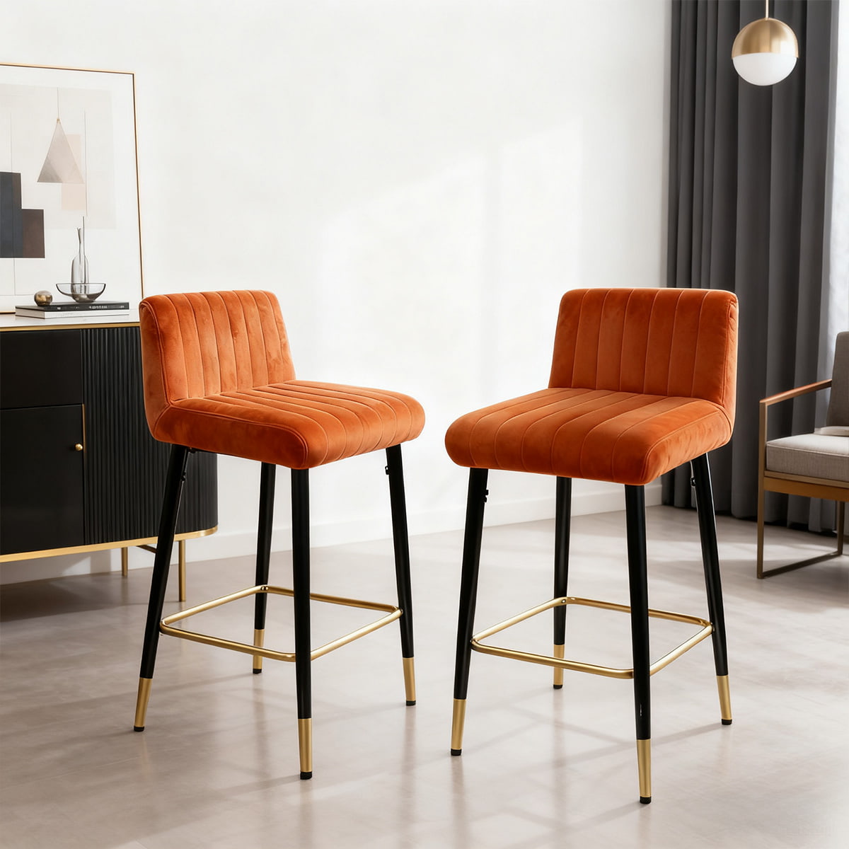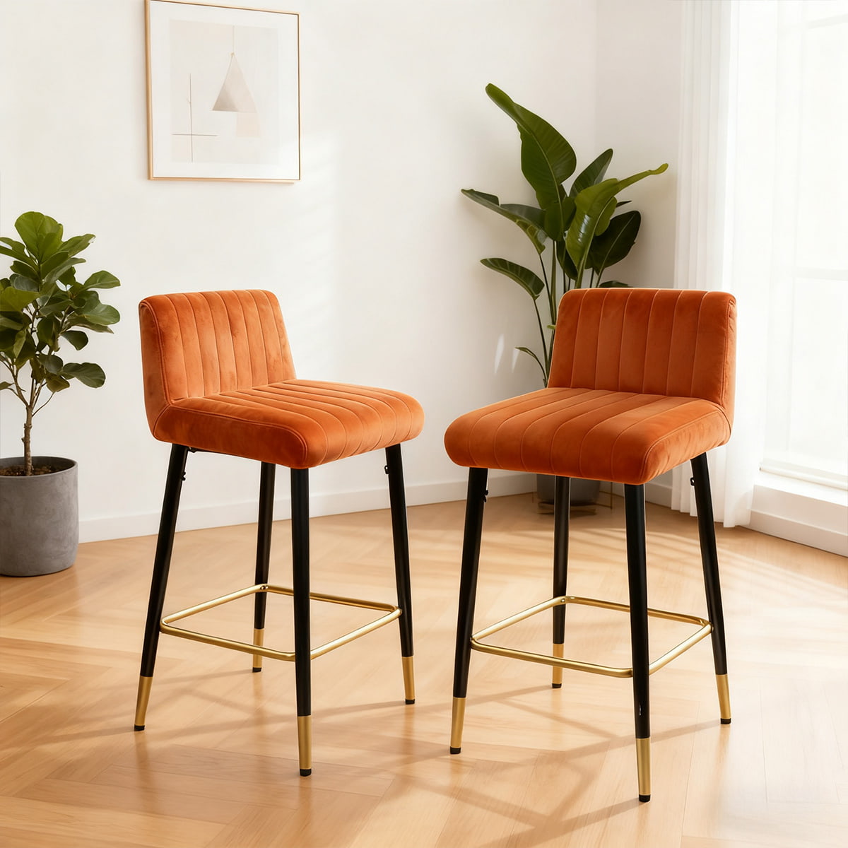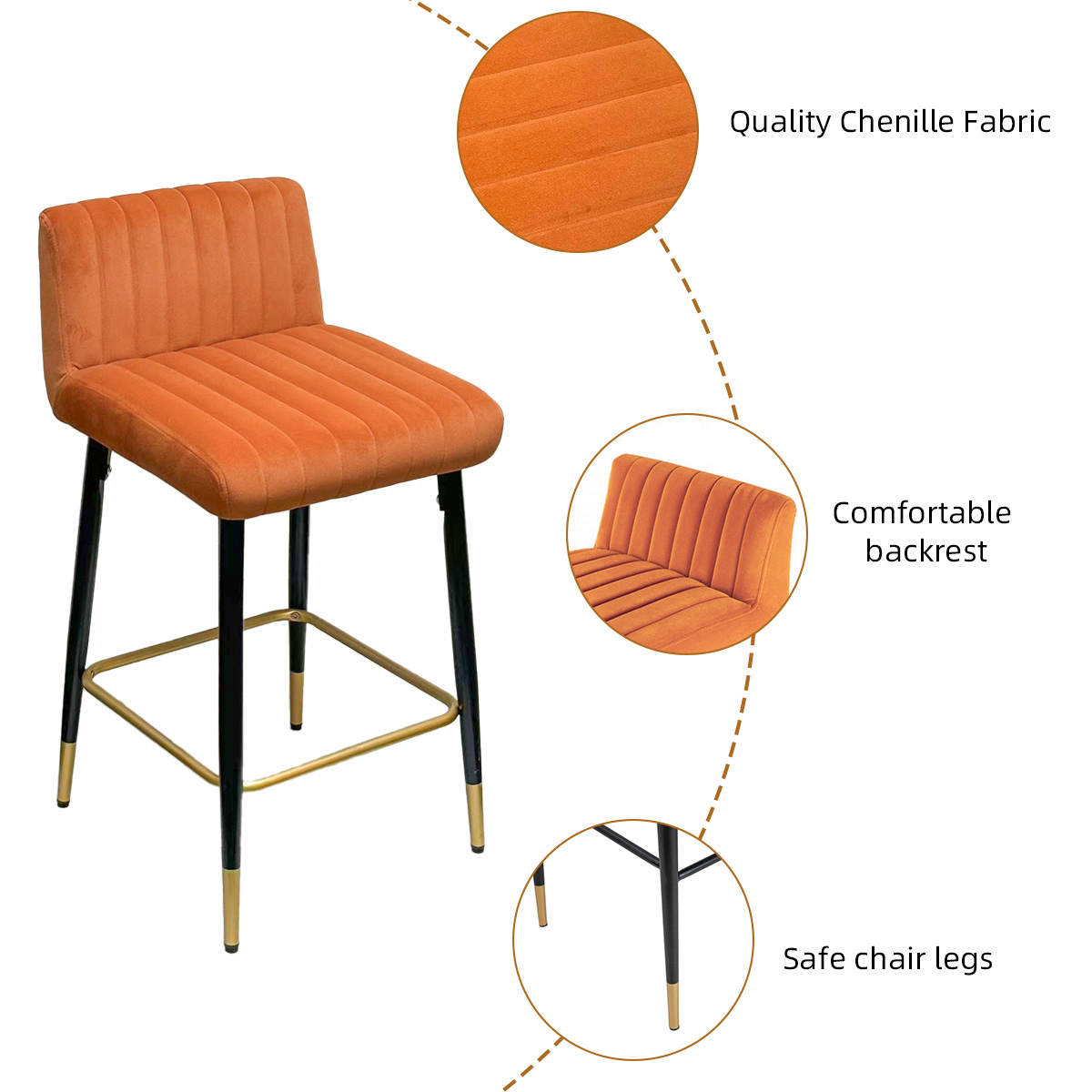 Stól Barra Veilbhit Oráiste Nua-Aimseartha - Cathaoirleach Airde Cuntar Sclóine 360° le Cosa Miotail Dubha & Óir, Suíochán Bog Cumhdaithe agus Coisbheart le haghaidh Oileán Cistine, Beár nó Seomra Bia