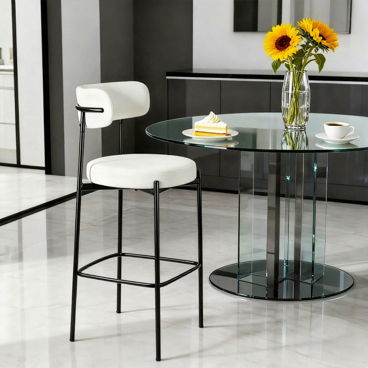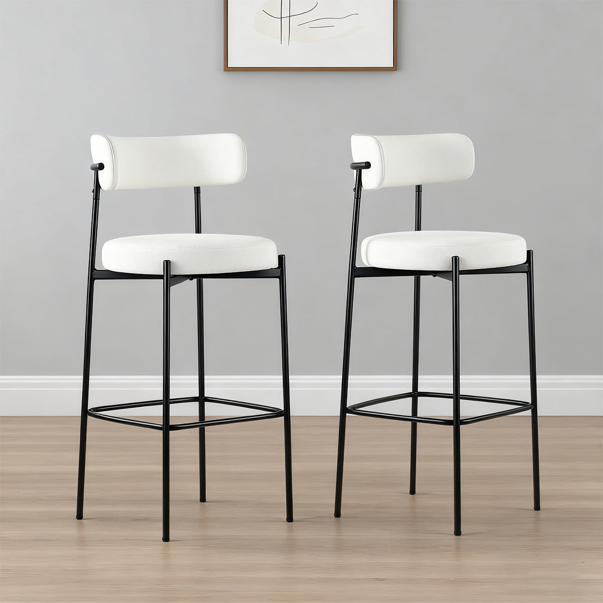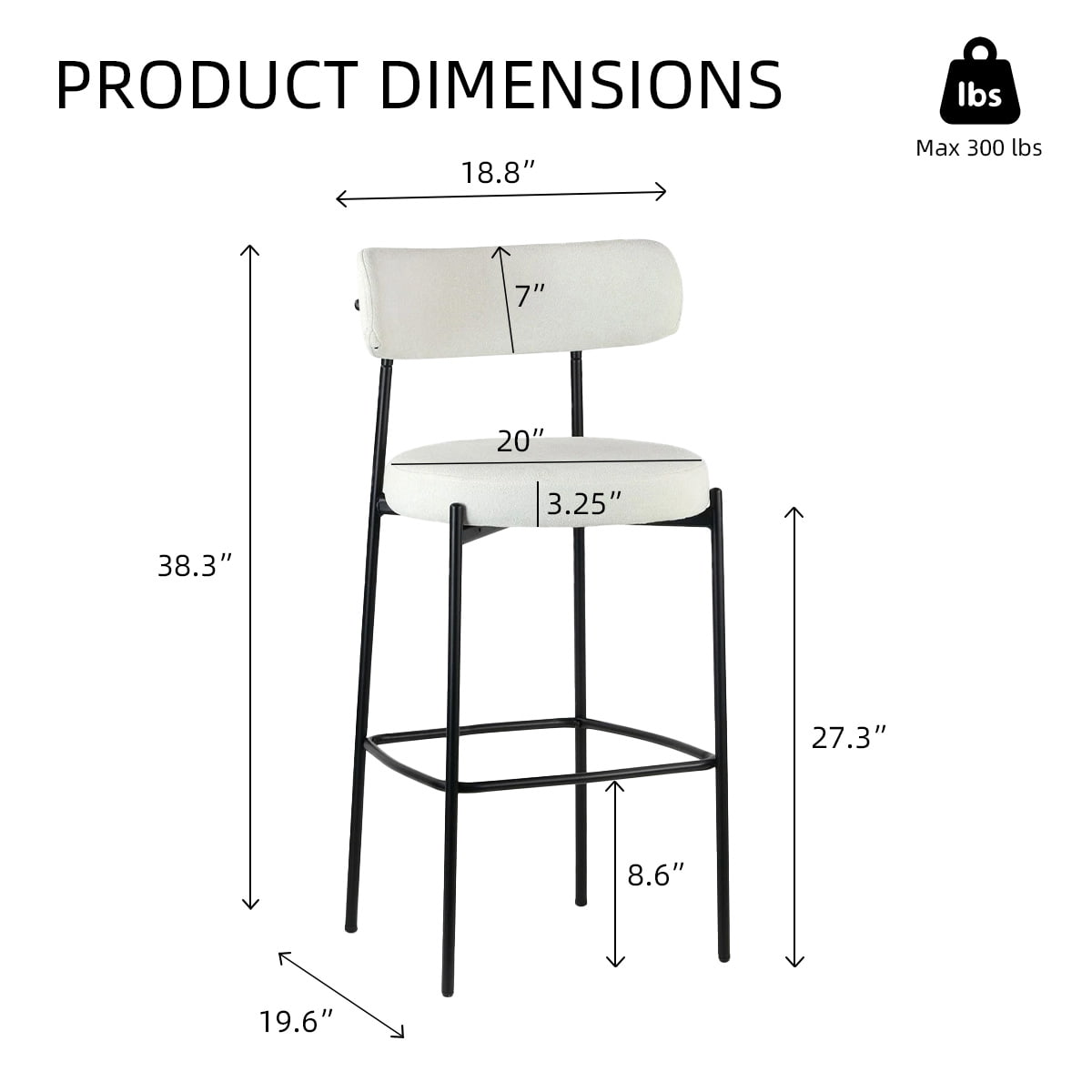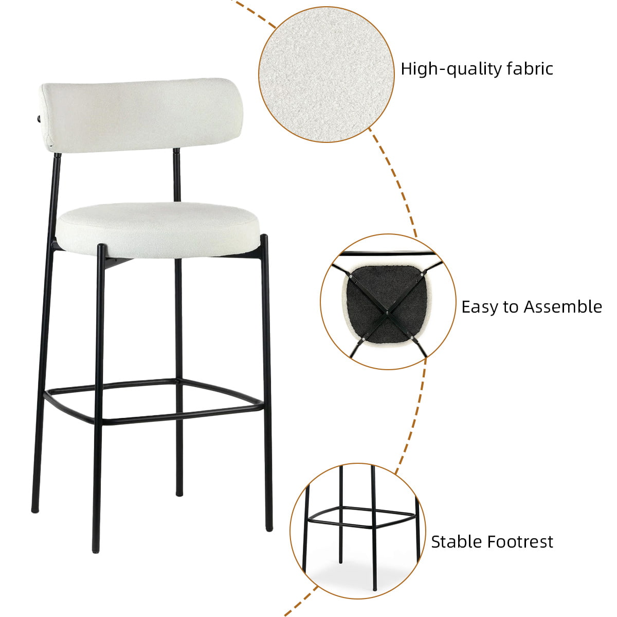 Déantar ár stóil cuntair bouclé bán a innealtóireacht le haghaidh compord agus stíl, ina bhfuil frámaí miotail dhubh marthanacha, suíocháin cúr ard-dlúis, agus cúlchistí eirgeanamaíochta - atá oiriúnach le haghaidh cuntair cistine, beáir, bialanna agus óstáin.