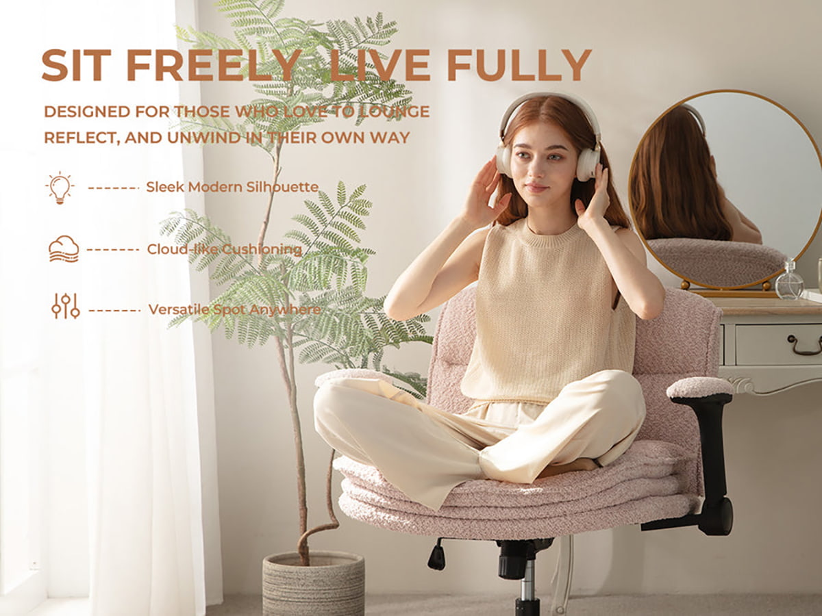 Déanann an mála aeir lumbar dinimiciúil oiriúnú do ghluaiseacht do chorp, ag cinntiú go bhfuil tacaíocht cheart dromlaigh ann le linn uaireanta fada oibre, staidéir, cearrbhachas nó gnáthaimh makeup. Ligeann sclóine mín 360°, coigeartú airde 2.8″, rocadh 90°–120°, agus casters ciúine aistrithe gan stró i rith an lae.