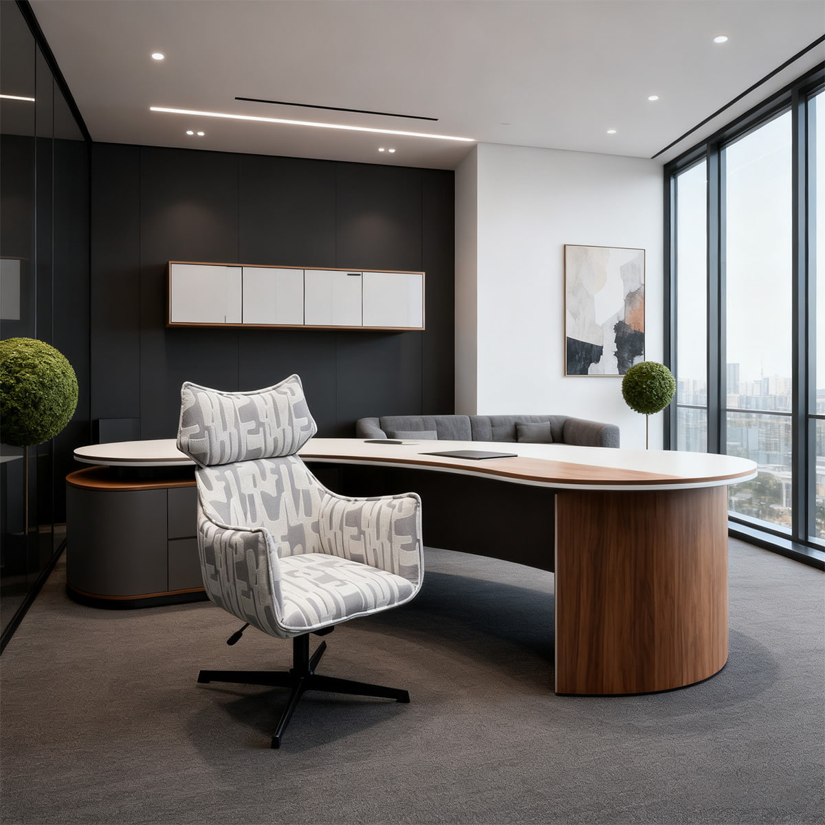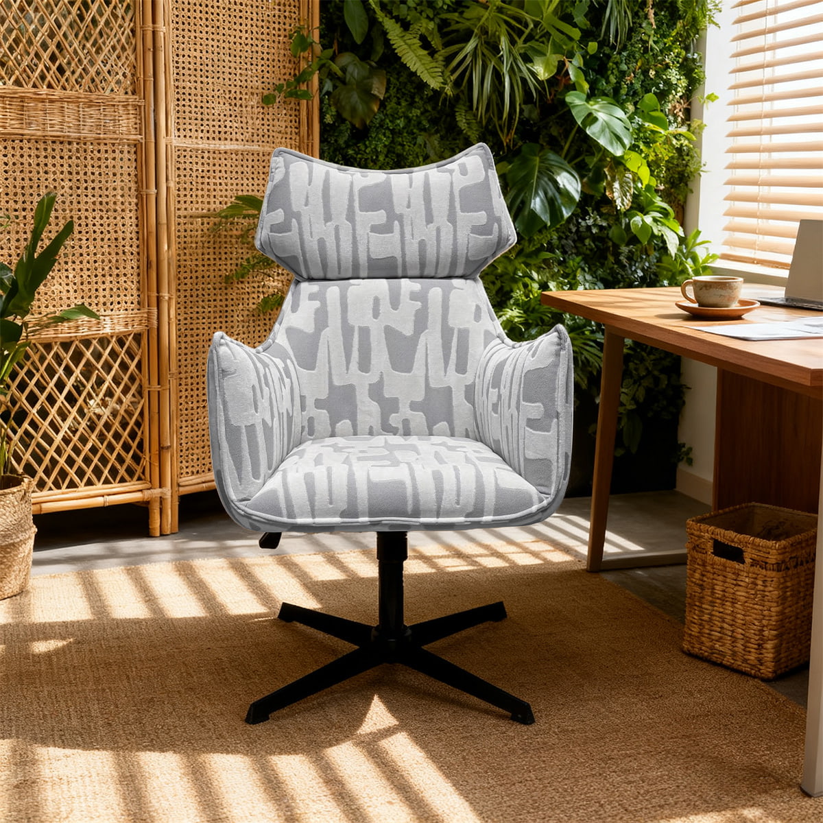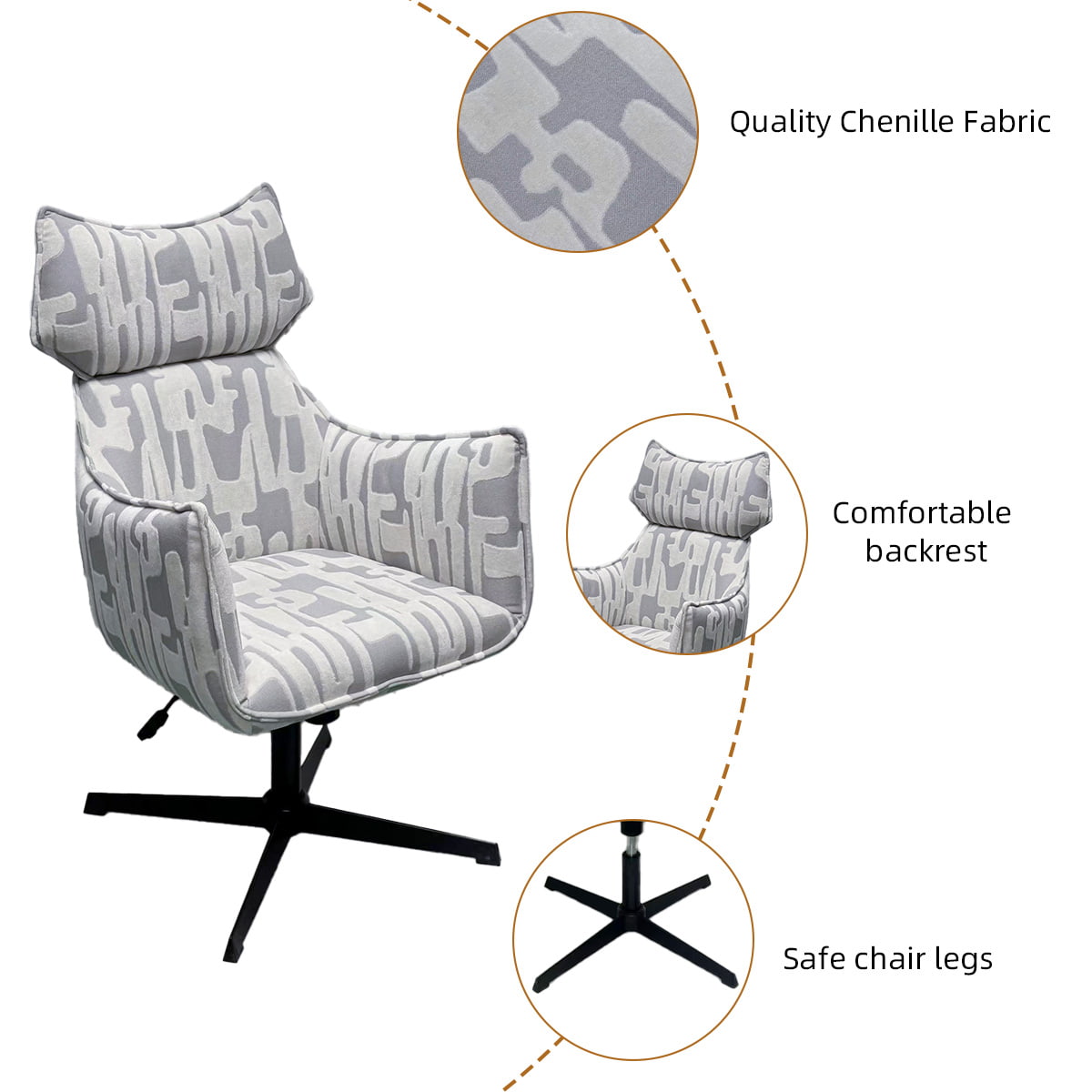 Déanann a chúltaca ard agus a chomhrian eirgeanamaíochta do spine a chliabhán, agus cinntíonn stuáil cúr plush compord cosúil le scamall le linn uaireanta fada léitheoireachta nó scíthe. Tugann an patrún liath comhaimseartha agus na cosa cruach caol teagmháil nua-aimseartha na hEorpa chuig aon spás - cibé acu is oifig bhaile, seomra óstáin nó tolglann cruthaitheach é.